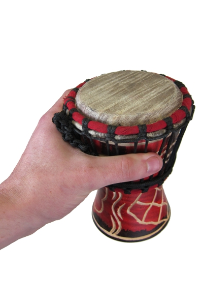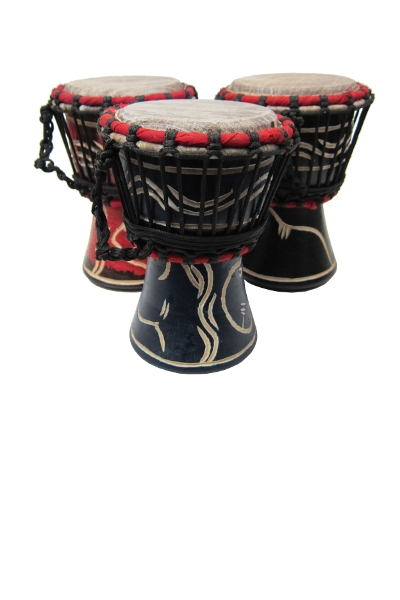 We love this little djembe drum, fully carved and built like a full size African djembe drum, just smaller. As a playable musical instrument this mini djembe sounds more like a bongo, and can be tuned to play in pairs. The size makes it perfect for younger players, or for gifts, decor, or corporate promotions.This small djembe features: