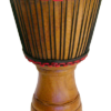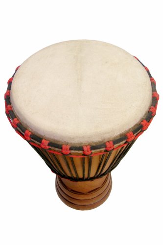 These Paragon Ivory Coast Djembes are custom built to our specifications for sound and wood quality, dimensions and shape, and durability. By African-made standards these are high-end djembes, suitable for teachers, students, performance, and drum circles. The shell is carved of top-rate Iroko hardwood, precision crafted with even thickness, fully cleaned out, and well oiled. The skin, rope, and rings are the best of what is available to local drum builders. The shell quality is professional grade, as is the skin. The Ivory Coast djembe is available in 3 sizes,all with same colors of rope and cloth, and similar geometric designs carved into the base.