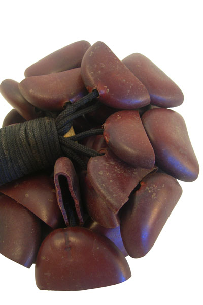 - About 30 large hollow Togo seeds halves attached with strong rope