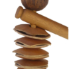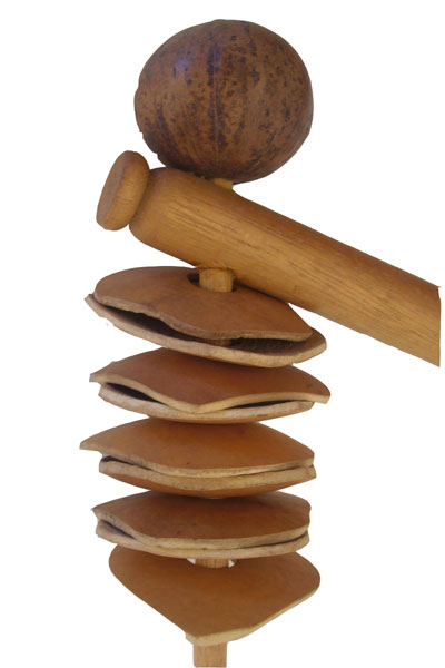The wasembe (wah-SEM-bay) rattle creates a very loud, high pitch, striking sound when the gourd slices clack together. Versions of this instrument exist all throughout Africa, known by different names, including ratatak, telewasa, and wasaumba. It is played with quick downward motions, causing the gourd slices to move up and down the connector stick. It is 12″ tall with a solid Odum handle.